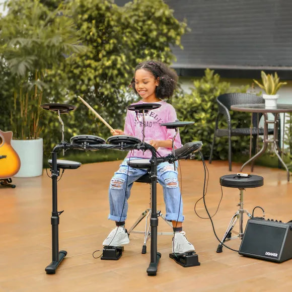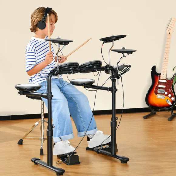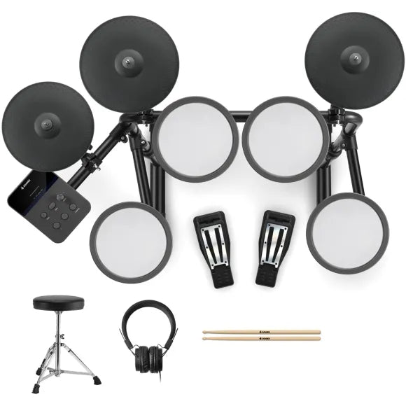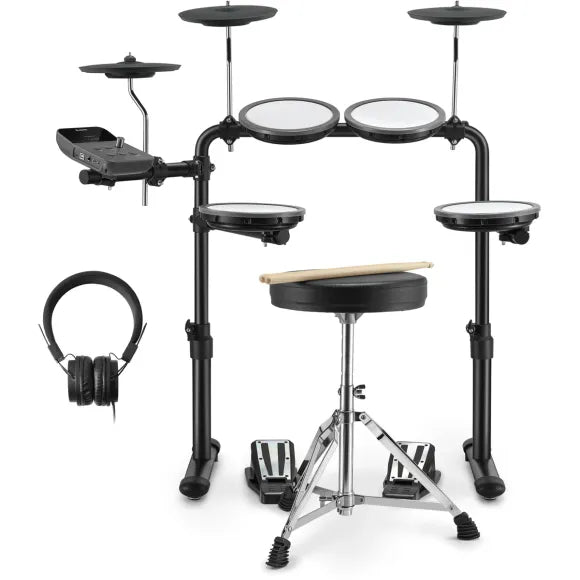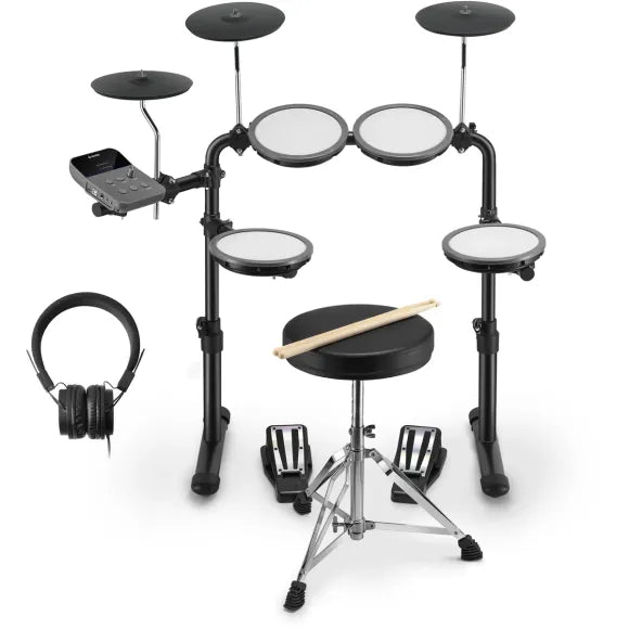 Det följer också med en stabil och justerbart metallstativ för montering av trummor och cymbaler, alla nödvändiga kablar, en trumstol, hörlurar och trumstockar. Så du behöver bara montera komponenterna på stativet, ansluta paddarna till ljudmodulen och sätta in strömkabeln i vägguttaget - och så kan ditt barn börja trumma loss.